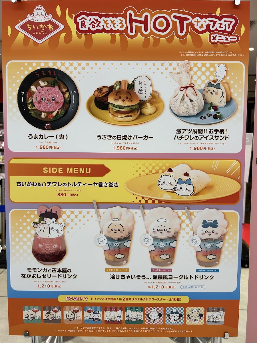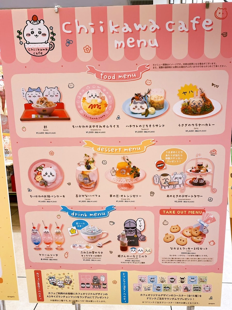 - Creative Menu: The menu showcases a delightful range of dishes and drinks inspired by popular culture, including whimsical treats like the ちいかわクリームソーダ, which impresses with its adorable presentation and striking colors.